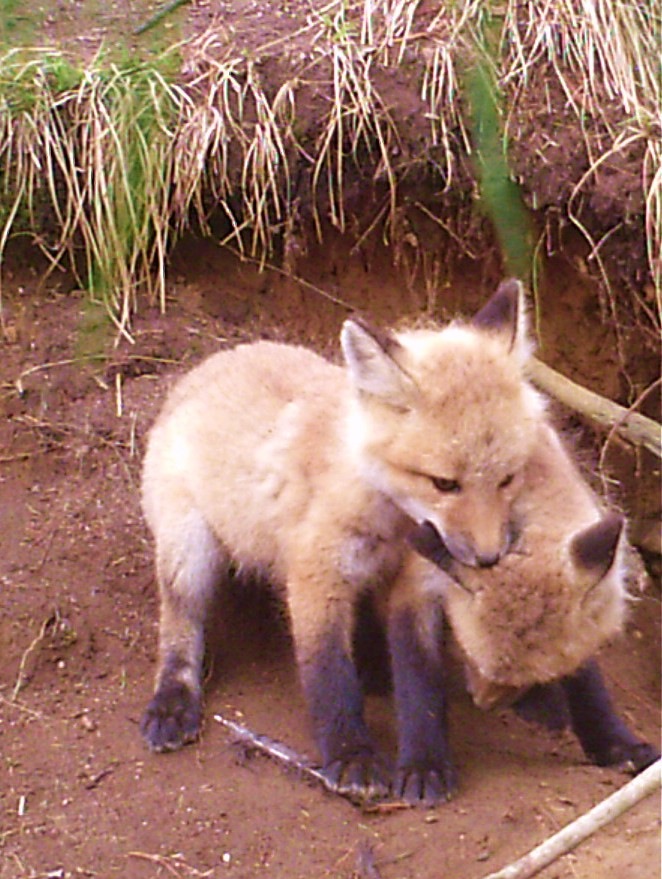 Female foxes, vixens, generally give birth to 3 to 5 pups in March or April. Once the pup’s eyes open, ten days after birth, the pups spend most of their time playing with bones, feathers and other bits of their dinner brought home by their parents. At 12 weeks of age their parents begin to teach them how to hunt. The family may stay together through the winter or the pups may disperse in early winter to find territories of their own.