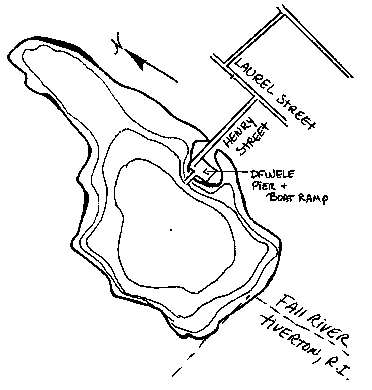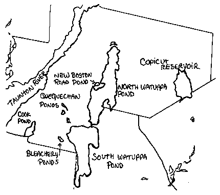 South Watuppa Pond This 1446 acre warmwater pond has an average depth of 15 feet and a maximum depth of 22 feet. Transparency is low at three feet and aquatic vegetation scant. The bottom is composed of rubble, rock and muck and there are numerous rubble-strewn shoals. Parts of the ten-mile shoreline remain wooded but only a small portion is accessible to the public. ![]() Access to the pond is provided through a paved boat ramp and parking area at Dave's Beach located off Route 24 at the northeast corner of the pond just south of Route 195. Parking space is available for approximately 50 vehicles. Cook Pond This 154 acre warmwater pond has an average depth of 10 feet and a maximum depth of 18 feet. Transparency in the pond is 6.5 feet and the bottom is composed of rubble, rock, and muck. Emergent wetland vegetation is common along the 2.6 miles of shoreline and submerged vegetation virtually nonexistant. ![]() Access to the pond is provided by a Division of Fisheries, Wildlife, and Environmental Law Enforcement (DFWELE) fishing pier and paved boat ramp at the end of Henry Street, which is off Laurel Street. The paved parking area can accommodate 50 vehicles. In 1993 the state Public Access Board (the construction arm of DWELE) rebuilt the ramp, parking lot, and the handicapped-accessible fishing pier. Day to day maintenance is controlled by the Fall River Department of Public Works. Today, the parking lot is in poor condition (i.e.potholes) and requires improvement. Northern Gama Grass (Tripsacum dactyloides), a rare species of grass, inhabited the eastern shores of Cook Pond until sometime within the last decade when, it is believed, residential development wiped out the last patches of habitat. Historical Alteration of Water Resources When the European settlers first arrived, the land mass which later became Fall River was a wilderness area extending from several miles east of the Watuppa Ponds west to the Taunton River and Mount Hope Bay. Water flowed from the freshwater ponds into the river and estuary via a stream about two miles long. The stream flowed out of South Watuppa for about one and a half miles in a narrow and fairly straight channel until it reached the area which is now Main Street. Then it cascaded over an escarpment, through a deep gulf with high rocky sides and fell about 129 feet over a series of ledges into a pond at the base, which emptied into the Taunton River. The native American name for the stream, "Quequechan" was apparently inspired by the beauty of the falls. The name denoted "falls river", "leaping waters", or "flying fish". According to the Phillips History of Fall River, Fascicle III, the present location of Government Center looked something like this: "...There the waters of the river...collected in a pool...From this point the waters dashed over the hillside, from a height of one hundred and fifty feet to the lower basin...Among the lily pads, in this upper pool was a resting place where game birds found a hiding place in the reeds and bushes along the banks, and in the spring, the fish could be seen leaping up the falls." The abundant freshwater fish stocks included yellow and white perch, pickerel and horned pout. In the Taunton River, yearly runs of shad and herring provided overwintering foodstocks for the early settlers. Sturgeon and eels were also common and tautog, scup, striped bass and tomcods were plentiful in the Mount Hope Bay. Black bears, wolves, white-tailed deer, hares, wild turkeys, ruffled grouse and other game birds inhabited the forests. According to maps and historical accounts, an intricate network of small streams and ponds crisscrossed the land north and south of the Quequechan, all of which have suffered diversion or alteration in the intervening two hundred years. Two major land purchases in the 1600's resulted in the acquisition of a large portion of the present city by private parties, Europeans who had settled in Plymouth County. The Freeman's Purchase in 1657 from the Wampanoag Chief Wamsutta involved land north of the Quequechan River. The deeds included "all the waters, brooks and ponds" within the purchase boundaries and thus left the ownership of the river and the Watuppa Ponds in the hands of Benjamin Church. Church later sold these lands and water rights to Richard Borden in 1714. Most of the land south of the Quequechan (including Cook Pond) was acquired by Stephen Borden through the Pocasset Purchase in 1680. During the 1700's the Quequechan River turned the water wheels of saw mills, grist mills and fulling mills which were built along the banks. When the era of the cotton mill dawned, the potential water power provided by the last quarter-mile of the river as it tumbled over the escarpment attracted mill developers in the early 1800's. While Fall River's first cotton mill was built in 1811 in a stream emanating from Cook Pond, the second, Troy Manufactory, was constructed at the base of the Quequechan Falls in 1813. At that time, the mill owner constructed the first dam on the river to reserve water. This event signaled a period in the city's history during which our surface waters were chiefly regarded as commodities to be used to drive industrial and econnomic development without evaluation of potential environmental consequences. Other mills located along the Quequechan Falls and, in 1827, a second dam was constructed by the Watuppa Reservoir Company, an association of mill owners. This company subsequently bought or otherwise acquired flowage rights along the Quequechan River, as well as along both Watuppa ponds. These actions secured for the Reservoir Company absolute authority to withdraw unlimited amounts of water and to dam or otherwise manipulate the flow of the Quequechan to accomodate the operation of the mills. Fall River's town hall was first located in the northern (Steep Brook) section of the city. In 1845 a new town hall was constructed in a more central location on Main Street, and this portion