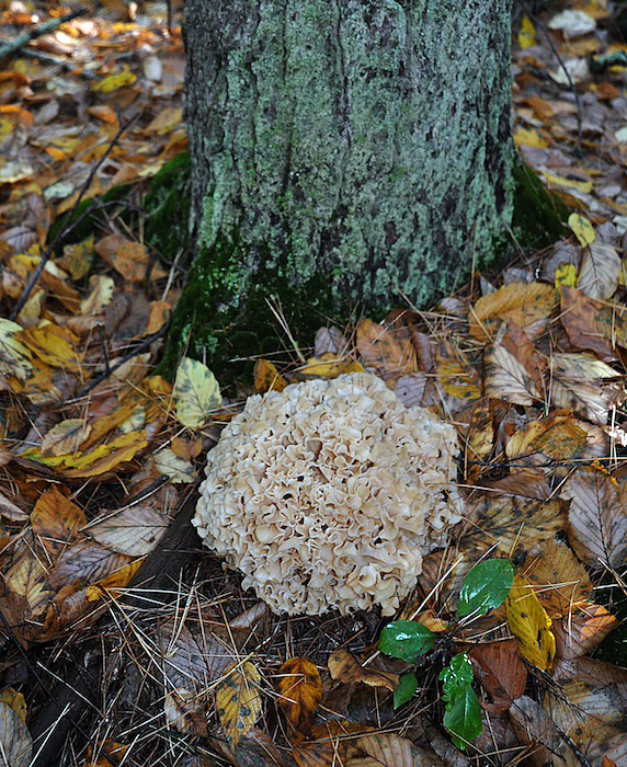 A cauliflower mushroom (Sparassis crispa) at the base of a white pine.