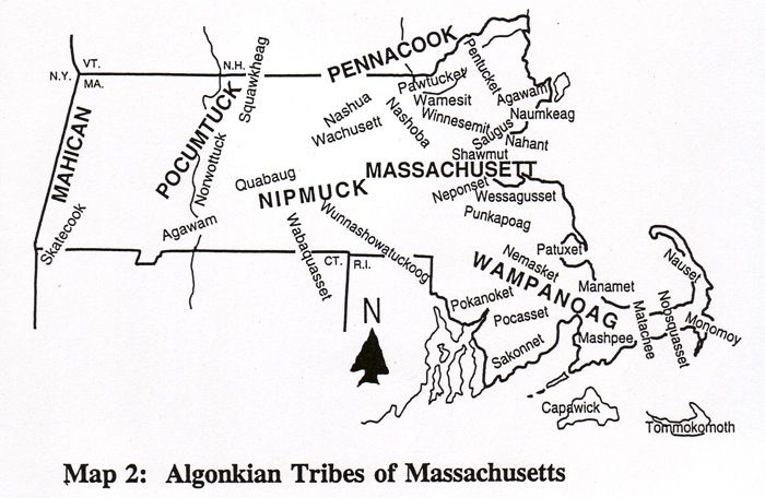 These early hunter-gatherers eventually evolved into a linguistic family of tribal nations that ranged over most of the northeastern United States, the Algonkians. In New England, there were seven principal confederated Algonkian nations, including the Abenaki (Maine), the Pennacooks (New Hampshire), Pequots (Connecticut), the Narragansetts (Rhode Island), the Pocumtucks, the Nipmucks, the Massachusetts and the Wampanoags. Map 2 shows the territory of these nations and their tribes.