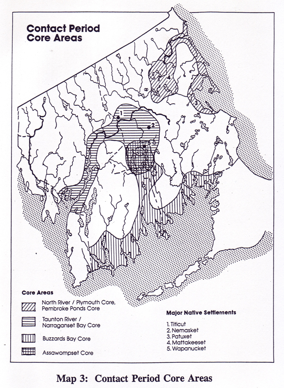 Along the lower reaches of the Taunton River, the dominant native tribe was the Pocassets, whose territory straddled the Taunton River and extended from Gardner’s Neck on the west to the Westport town line on the east, from the southerly boundary of Tiverton on the south to all of Freetown on the north. It included the present-day towns of Fall River, Somerset, the Gardner’s Neck section of Swansea, Tiverton and Freetown. The principal village of the Pocassets was Mattapoisett or Shawomet in today’s Somerset. Map 3 shows the concentration of native tribal settlements along the Taunton River corridor.