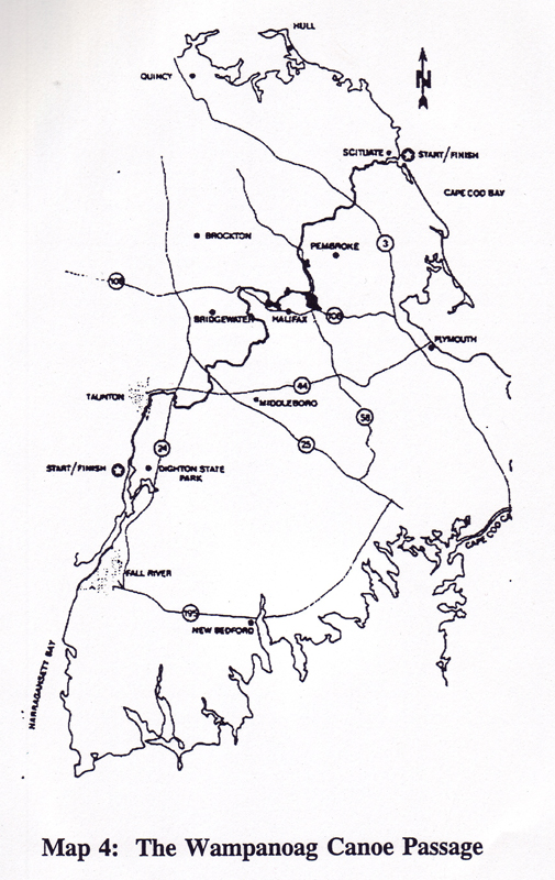 The Taunton River was a major route of travel and communication for native tribes. Travel on the river was either by birch canoes or by dugout logs (made by burning out the center of the log). These log boats could seat as many as 12 persons. The Wampanoags used an overland connection by canoe from Mount Hope Bay to Massachusetts Bay via the Taunton and Nemasket Rivers. The high point and watershed divide was at Little Sandy Pond in Pembroke. To the north, a connection was made with the North River and to Massachusetts Bay. This would have been a much safer, quicker and practical route to these water bodies than traveling along the coast. See Map 4 for the route of this Wampanoag canoe passage.
