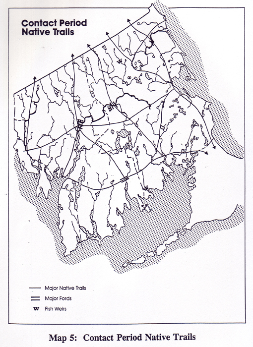 A major path led from Taunton south along the western side of the Taunton River to Somerset, paralleling what later became Route 138, and to the tip of Gardner’s Neck. At the southern tip of Gardners Neck, a ferry was operated by Corbitant, chief of the Pocassets during Colonial times, to Mount Hope, seat of the Wampanoags. Another major path used by the Pocassets was the Mowry Path, which proceeded along the eastern side of “Watuppa Lake” (the ponds were once one water body, and a bridge crossing at the Narrows did not occur until 1828). The Mowry Path connected the Pocasset Swamp in Fall River/Tiverton with the Taunton River where Mothers Brook enters the river. There was a tribal ferry at nearby Winslow’s Point, where the river narrows. Wamsutta reserved an area of land at that location out of the Freetown Purchase in 1657 “to be used by the Indians who kept the ferry.” Map 5 shows native trails that later became Colonial ways.