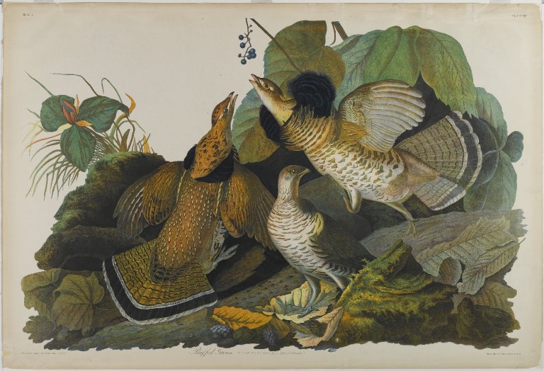 Like screech owls and a few other birds the ruffed grouse comes in one of two color phases depending on where the ruffed grouse lives. Birds from northern New England and up through Canada, where winters are long and the woods predominately gray, are usually grayer than grouse from southern New England down through the Appalachians where the winter forest is mostly reddish-brown . The grouse in the Audubon print, above, are reddish-brown phase grouse.