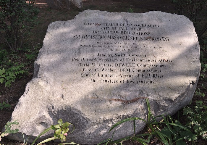 Rock in Freetown State Forest commemorating the creation of the Southeastern Massachusetts Bioreserve October 22, 2002.