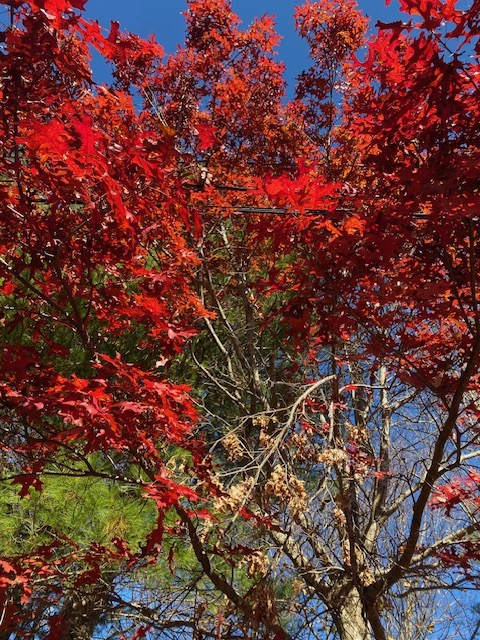Unlike the equally red leafed tupelo and the red maple, the brilliant scarlet oak hangs on to its leaves as long as possible.