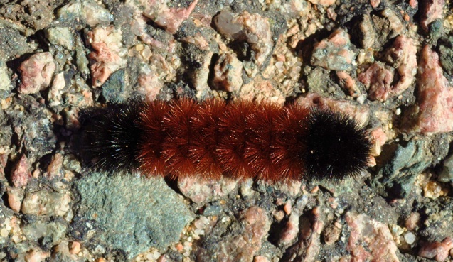 Wooly bears are black ...fore and aft ...and have a reddish-brown middle. In the late fall early colonial farmers consulted a local wooly bear to see how severe the upcoming winter would be.