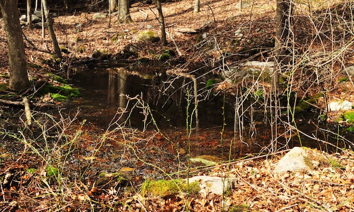 An autumnal pool, same as a vernal (spring) pool, except occurs in the fall when autumn rains fill depressions in the forest floor. Unlike vernal pools that in spring attract vast numbers of breeding salamanders, frogs and other amphibians, autumnal pools, in our neck of the woods, attract one species of salamander that breeds in the fall.