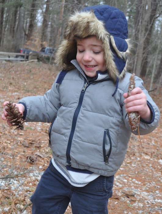 Top photo: Jumping stumps and rocks. Small children out in the woods instinctively know how to have fun and learn skills. Middle photo: Great exercise. Running And jumping to catch that pesky shadow that keeps following me down the trail. Bottom photo: A little celebratory pine tree dance with pine cones.
