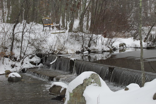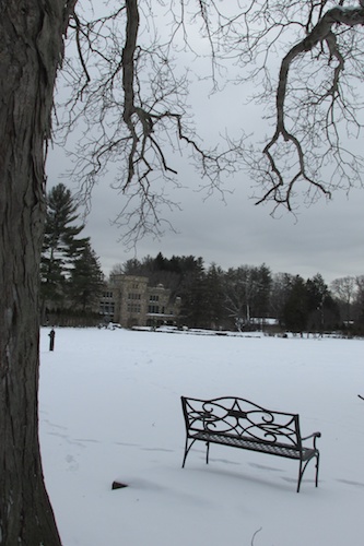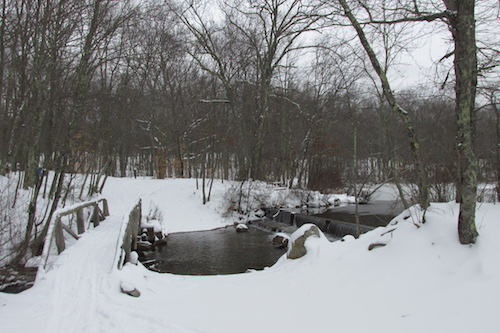 I was so lucky that a fresh snow had fallen all Monday, but that on Tuesday – my day off – the roads had been cleared and the temperature was perfect: cold enough so that the snow would remain powdery, but warm enough that I would not be uncomfortable being outside for two to three hours. The park has various types of trails, some more rugged and wild, and others wide and gentle, the latter being part of the system of carriage roads that the Ames family had built back in the early 1900’s. Many of the trails follow the shores of the park’s six ponds, with picturesque bridges crossing small waterfalls at the pond’s outlets, replete with benches for sitting and enjoying the view. Other trails climb up the hills in the northern part of the park; with over 20 miles of trails, I could not experience them all in one visit. From the parking lot near the visitors’ center, I skied over to view the snow-draped mansion and its lawn, garden and the remnants of the pool in which the Ames family used to enjoy swimming. There is a perfectly-pitched gentle hill right behind the mansion where apparently children enjoy sledding, for a sign there said “Sledding Hill closes at 4 PM.”