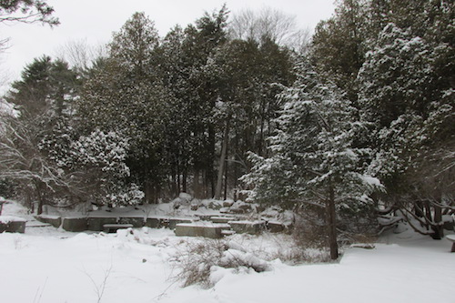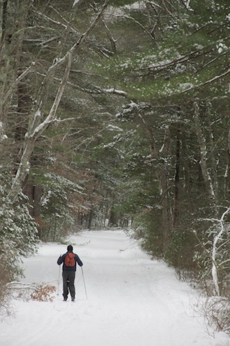 What a joy to glide down the wide snowy carriage paths, sometimes bordered on both sides by the quiet snow-filled forest, and at other times skirting the edges of an ice-covered pond, or alongside an old stone wall or a split-rail fence. Last winter, with the record snowfalls we got in Massachusetts, I enjoyed the very secluded trails of Freetown State Forest, but at times I felt a twinge of anxiety, skiing alone, that if I should twist an ankle or otherwise get hurt, no one might find me for days! So it is comforting that Borderland State Park, while not being crowded, is popular enough that one is likely to meet half-dozen other skiers, snowshoe-ers, and dog-walkers, even on a weekday. In other words, if help were needed, help would arrive!