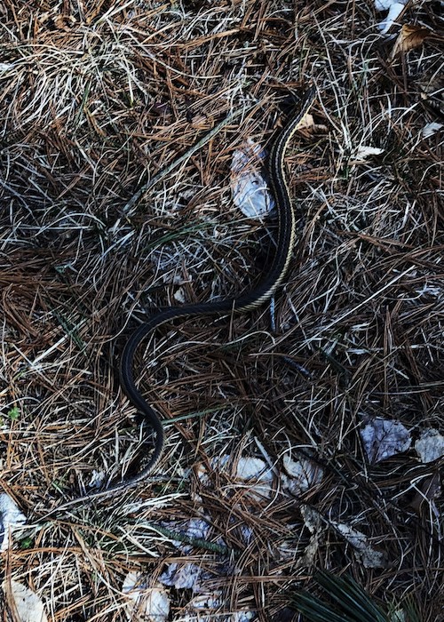 Taking advantage of the sunlight and climate change this eastern garter snake, who had to be fresh out of brumation, was crawling along the forest floor. Snakes, frogs, salamanders and other cold-blooded critters brumate away the winter. Warm-blooded critters, like woodchucks, chipmunks, meadow jumping mice, non-migratory bat species, etc. hibernate when their food supplies are in short supply or nonexistent in winter.