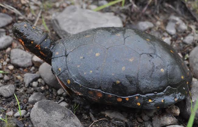 Along with the musk turtle, these black and yellow-spotted turtles are the smallest turtles found in the Bioreserve with a carapace (top shell) length of 3 to 5 inches. That carapace is black with small yellow spots scattered about, sometimes many on each scute (horny plate on the carapace) and sometimes only one and very rarely none. The yellow spotting also usually extends to the head, legs and tail. There is a large orange spot on each side of the turtle's head and the skin of the legs and inside edges of the shell usually also show some orange coloring. The underside shell (plastron) may be tan, light orange or yellow with a black splotch on each scute. With age these black areas expand. Some very old spotted turtles may have an almost completely black plastron.
