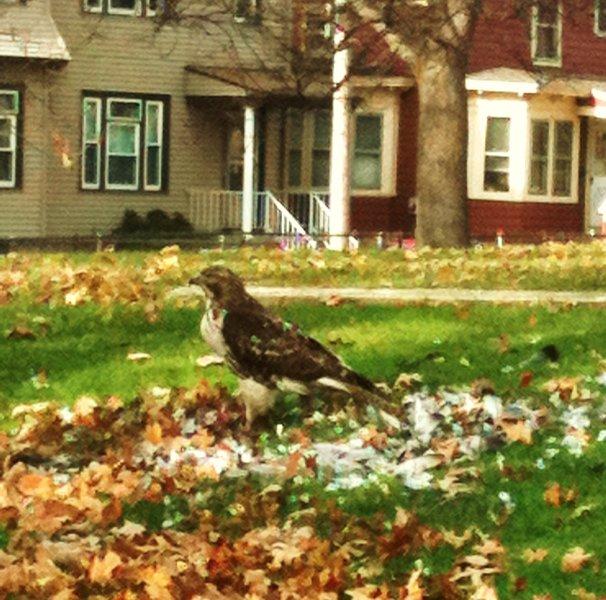 Nature is all around. Here's a quick cell phone photo, taken on the run, of an inner city red tail hawk dining on an urban pigeon on County Street in Fall River's Lafayette Park. Stay alert and observant!