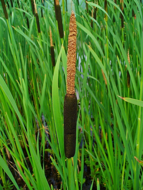 The broad cattail is a tall perennial plant with long, narrow grass-like leaves growing in colonies in shallow water marshes and along the edges of ponds, in lake coves, in drainage ditches, retention ponds and other freshwater impoundments. It grows best in full sun. Cattails can reach 6 to 8 feet in height.