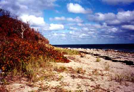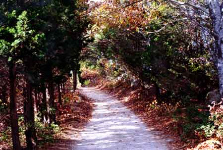 After you park the car and enjoy the invigorating ocean air and view, follow one of the many paths into a meadow scattered with scrub oak and pine , and hardwoods. All paths lead either back to 3A or to a dirt road. Get onto the dirt road, heading towards the ocean. You will pass an abandoned tree farm on your left.