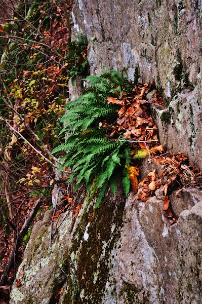 Walking over to the base of the ledge we get a closer look at the shiny, lustrous fronds (leaves) of the polypody fern. With a little imagination this fern, growing in colonies from tiny fissures in the rock face, gives one the feeling of stepping back in time to the Jurassic Period when ferns were the dominant vegetation and dinosaurs tromped about the rocky landscape.
