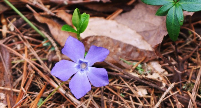 Creeping myrtle, Vinca minor, blooming along Blossom Road. Vinca is an attractive alien groundcover native to Europe from Portugal across to France, Germany and adjacent countries.