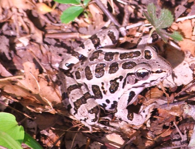 Pickerel frogs are often confused with leopard frogs, but in our neck of the woods pickerel frogs are much more common. Leopard frogs are generally larger with greenish colored backs and a random pattern of dark, roughly round shapes covering their body, head and legs. Leopard frogs also don't have yellow or orange colored skin on the lower belly and thighs.