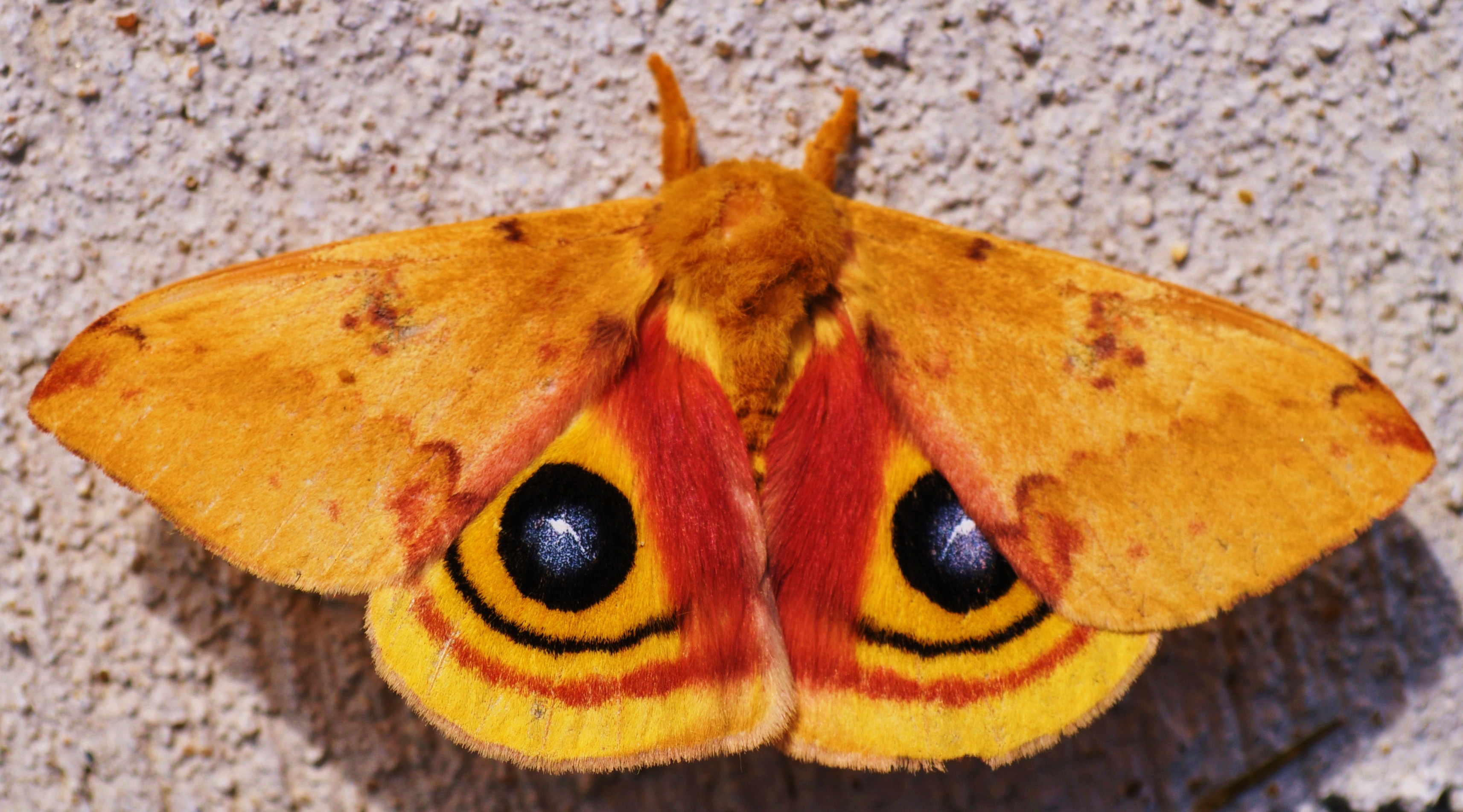Io moths have a wingspan of two-and-a-half to almost four inches. Males have yellow forewings, body and legs. Males also have large, feathery antennae which they use to detect and follow the pheromone trail left by sexually receptive females.