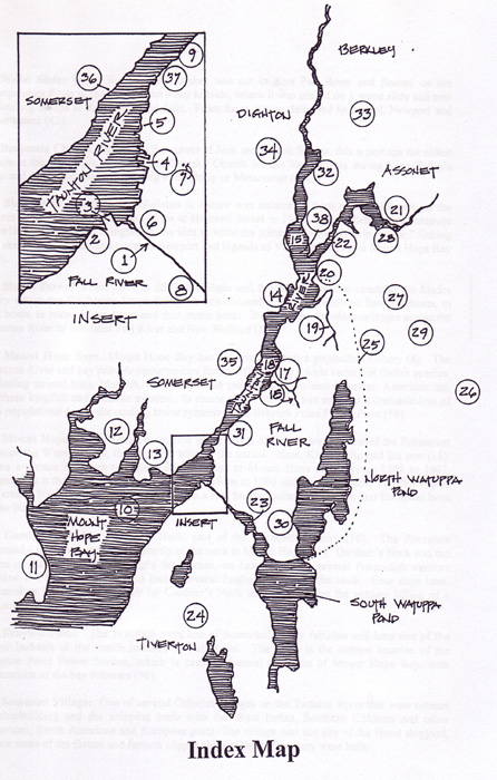 25. The Mawry Path: An old Pocasset path on the eastern shore of North Watuppa Pond that led from Tiverton north to the Taunton River. It was the route of escape of King Philip’s and Weetamoe’s forces from the battle of the Pocasset Cedar Swamp (21).