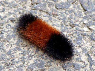 Wooly bears are black …fore and aft …and have a reddish-brown middle. Wooly bears were used by early colonial farmers to predict the severity of the coming winter. If the reddish-brown band is wide, the winter will easy. A narrow band forecasts a severe winter with lots of cold and snow.
