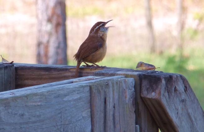 Male Carolina wrens sing throughout the spring, summer and fall. The have a wide repertoire of songs. Their most common call is often described as sounding like “teakettle-teakettle-teakettle.”