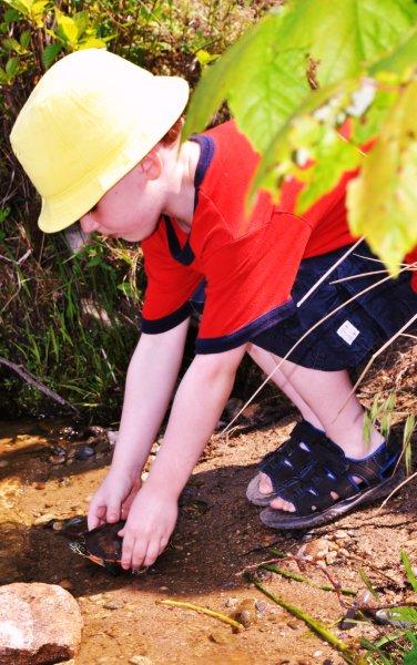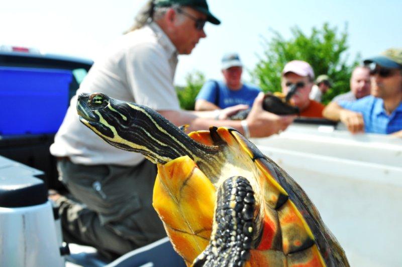 While a wildlife biologist, in the background, talks about a red bellied cooter …an eager one attempts an escape from the plastic bin.