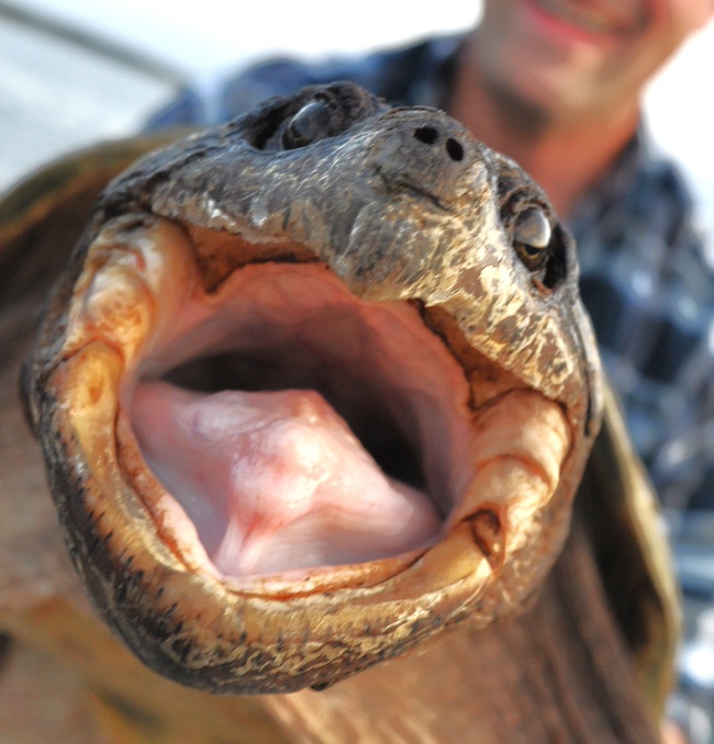An eastern painted turtle hatchling just out of its natal nest. Note the pointy egg tooth on the turtle's face. The egg tooth is what the baby turtle uses to cut its way out of the leathery turtle egg at hatching. The egg tooth falls off in a week or two since once hatched the baby turtle no longer needs it. Like you, the baby turtle has a "belly button". You can see its belly button on its bottom shell, plastron, where it had been attached to its egg yolk when it was developing in the egg.