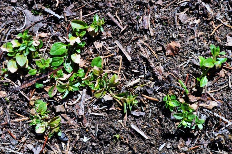 Chickweed. Pops up in early spring and as you can see from the photo it is just starting to grow. May grow in huge clumps right through the winter if the weather is not too severe. Mild taste with no bitterness. Makes a great salad base when combined with sharper tasting dandelion leaves, chicory, winter cress and other spring greens.
