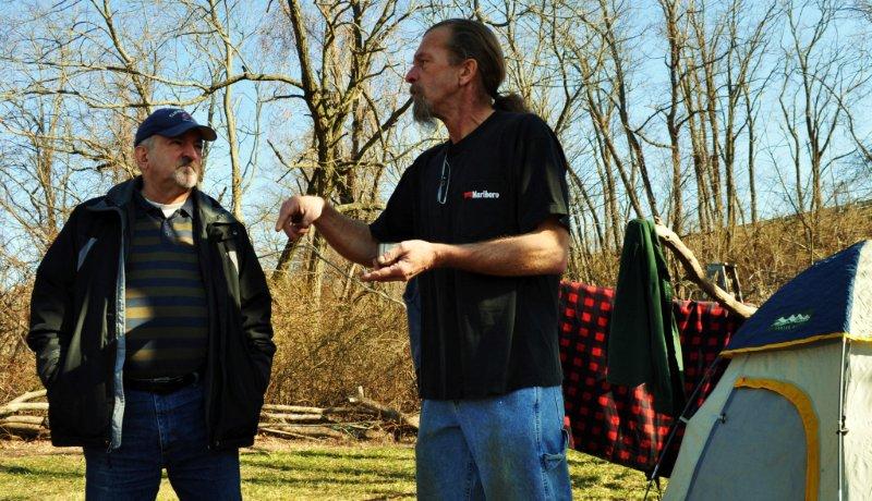 Coalition for Responsible Siting of LNG Facilities’ President Joe Carvalho, left, visits Dave Frederick at his home on the Wedge Lot.
