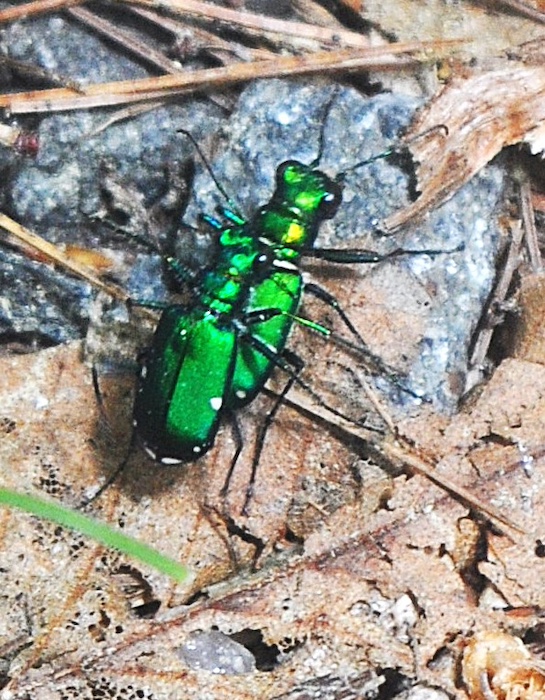 Here we have an apparently happy pair of emerald green six-spotted tiger beetles. They are fierce and fast, beautiful and beneficial as they prowl the summertime forest looking for flies, mosquitoes, inchworms and other beetles and small insects to eat. They are harmless to humans as they scurry about the sunny forest floor. Watch for them as you walk along. More on the six-spotted tiger beetle here- info: https://en.wikipedia.org/wiki/Cicindela_sexguttata#:~:text=4%20External%20links,metallic%2Dblue%2Dgreen%20elytra.