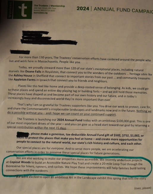Note paragraph at bottom of letter circled in green. No mention that their Copcut Woods property is within the Southeastern Massachusetts Bioreserve, no mention of BIPOC children or other silly woke jargon they used in their grant application to access gasoline tax money from the state to damage the landscape, no mention that this construction of their "discovery" trail would be in a dedicated bioreserve.