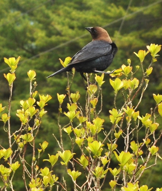 Let's look at one New England non-native species that thrives in fragmented forests, the cowbird. When the forest is fragmented the cowbird moves in and kills off native species. Cowbirds evolved and belong on the Great Plains, not in the New England forest. On the Great Plains cowbirds were nomadic, following huge herds of bison feeding on the insects and ticks that tormented the bison and on insects that the bison stirred up as they moved along on migration. With the near extinction of the bison, clearing of the great eastern forest (our forest) and the appearance of farms and livestock, the cowbird switched from the fast disappearing bison to domestic cattle. Originally having to follow bison in order to survive, cowbirds evolved the strategy of laying their eggs in other birds' nests and then quickly moving on. Nest parasitism enables the cowbird to have other species hatch their eggs and raise their young while they stay with the herd. In the early spring cowbirds return with the earliest migrants often arriving with warblers, vireos and others. Wide trails and other man-made openings in the forest make ideal locations for cowbirds to locate and scout for victims.