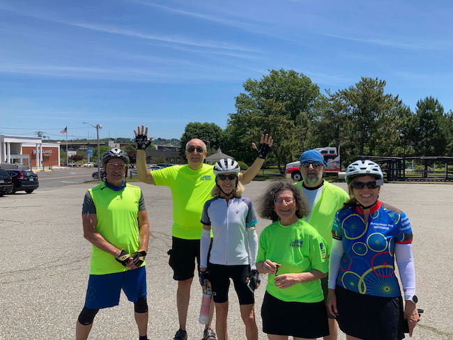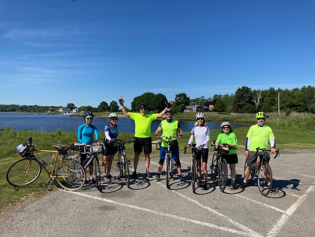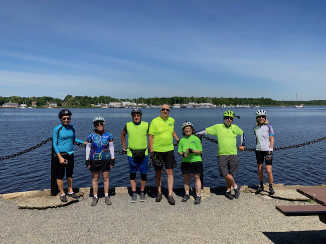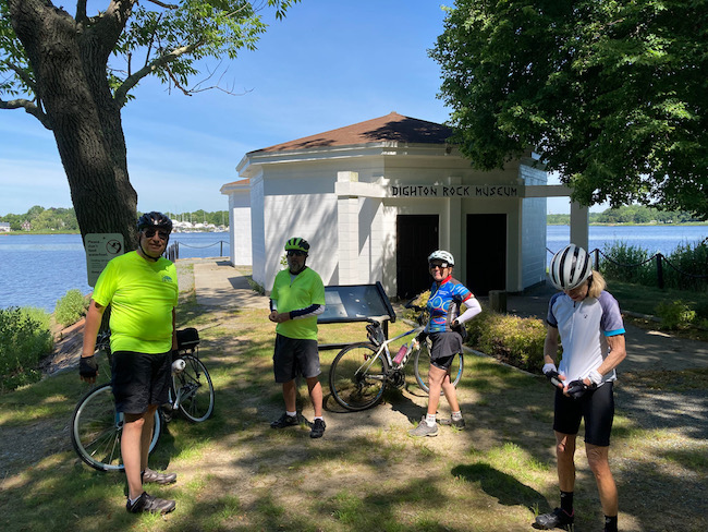 On a beautiful Friday morning a group of 8 riders circumnavigated the Taunton River. Our ride started at the Park & Ride in Somerset. Along the way we stopped at the Dighton Boat Launch for a panoramic view of the Taunton River. We then rode over the Dighton/Berkley bridge and stopped on the Berkley side for refreshments and a pit stop. We then decided to check out Dighton State Park for another beautiful view of the river. To the north we could see the Dighton/Berkley Bridge. Across the river we could see the boat yard we had passed on the Dighton side. Proceeding a little further we found Conspirator’s Island. This is where Loyalists plotted their next steps in the Revolutionary War. The next leg was the hardest, with many hills on the east side of the river. Finally, we acrossed the Veterans Memorial Bridge, back into Somerset. What a fantastic day...