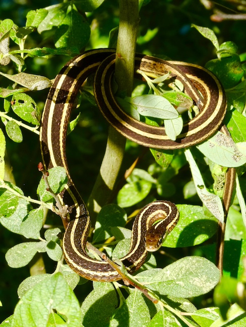An eastern ribbon snake enjoying the sunshine. The ribbon snake (Thamnophis sauritus) is closely related to the more common eastern garter snake (Thamnophis sirtalis). Ribbon snakes like wetlands and shrubbery. Garter snakes are habitat generalists and may be found in meadows and fields, woods and even in urban backyards.