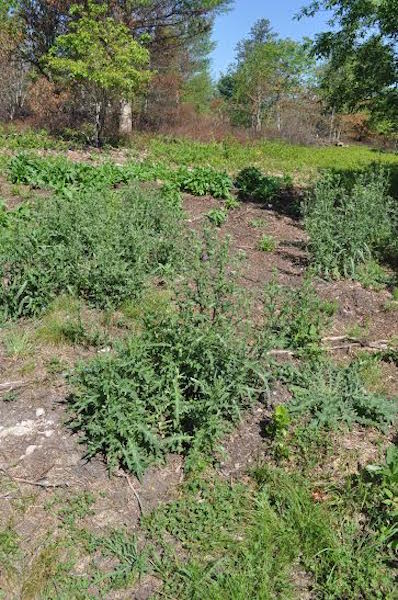 European thistle invading after DCR burned huckleberry and ferns and heavy equipment disturbed forest soil.