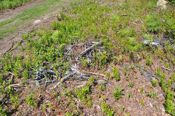 Rubber/plastic and wire tubing discarded by forest road where brush was being cut back and where burn took place. No one thought to pick this up?