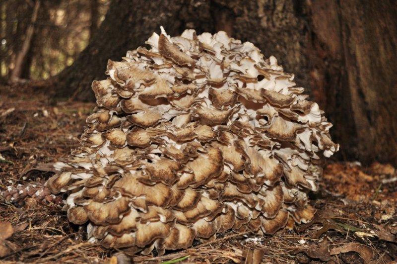 The hen of the woods fruiting body is a light tan to dark brown fleshy mushroom, consisting of multiple caps, growing in rosette form from a single stalk. It is usually found, at the same time each fall, at the base of oak trees. Although this mushroom may weigh as much as one hundred pounds, most found will be in the three to ten pound range.
