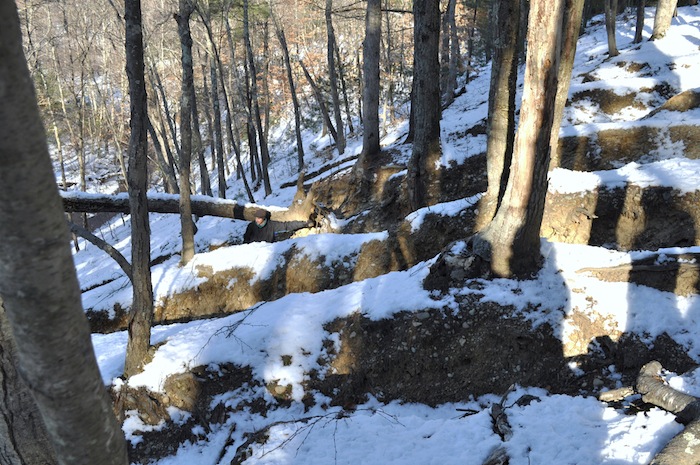 Big erosion rut with trees that have fallen.