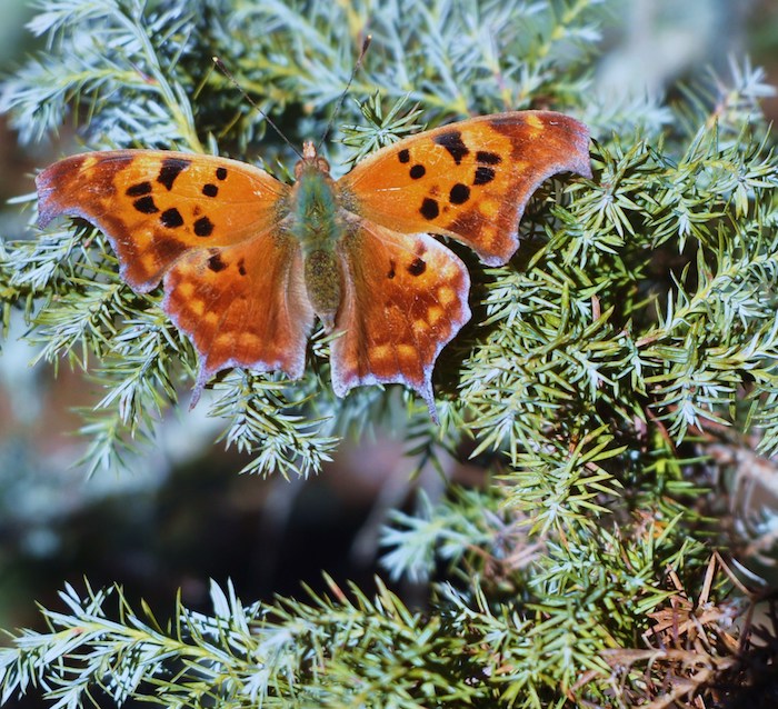If the sun cooperates and we get a rare 50 degree afternoon in late February we may see a bright spot of living color in the mostly grey and brown still winter woods. This question mark butterfly (Polygonia interrogationist) took a break from hibernation and was resting in the sun on a 54 degree late winter afternoon,