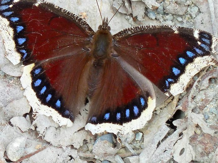 Many folks think that all butterfly species die at summer's end except for the black and orange monarch that, incredibly, migrates south to spend the winter mostly in Mexico, although some do winter in Florida and the Caribbean Islands ...but not all species die or follow the sun south in fall. Utterly charming, when seen on a chill 50 degree winter afternoon, is the mourning cloak butterfly, another butterfly species that stays in its hollow tree, rock crevice or other sheltered location sleeping away the New England winter until warmed by the late winter sun.