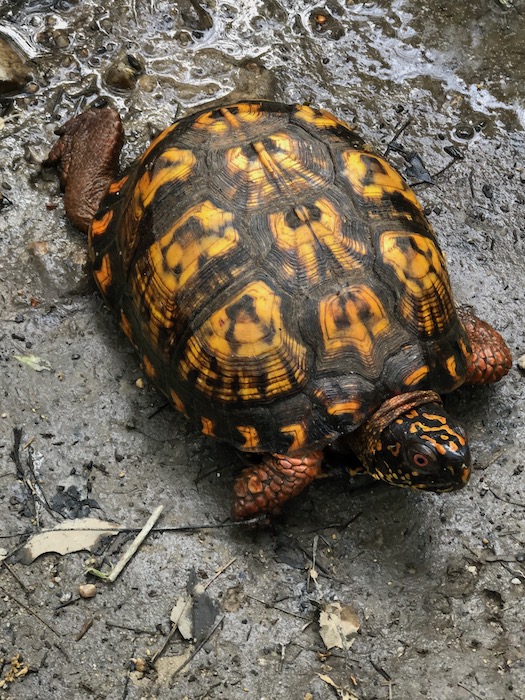 At about a third of the way through May's walk the walkers encountered another walker. Liz took a photo of this young and handsome male, eastern box turtle out looking for some female companionship. June is when most local turtles lay their eggs,