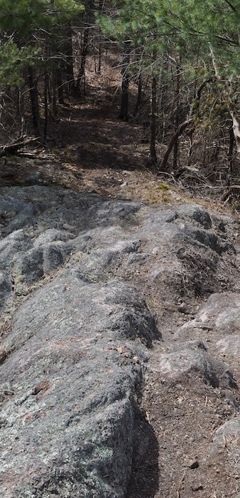 Motorized vandals illegally cut trees and shrubs from an existing illegal trail to climb to the top of a granite knob. As you can see from the photo the granite rock, at the top of the illegal trail, is now devoid of the reindeer moss and other mosses, rock tripe and other lichens, polypody and wild columbine that once grew there. These small rocky outcrops are tiny ecosystems and few in number in this relatively flat coastal forest. It is a shame to lose them and diminishes the biodiversity DCR is supposed to be encouraging and protecting.