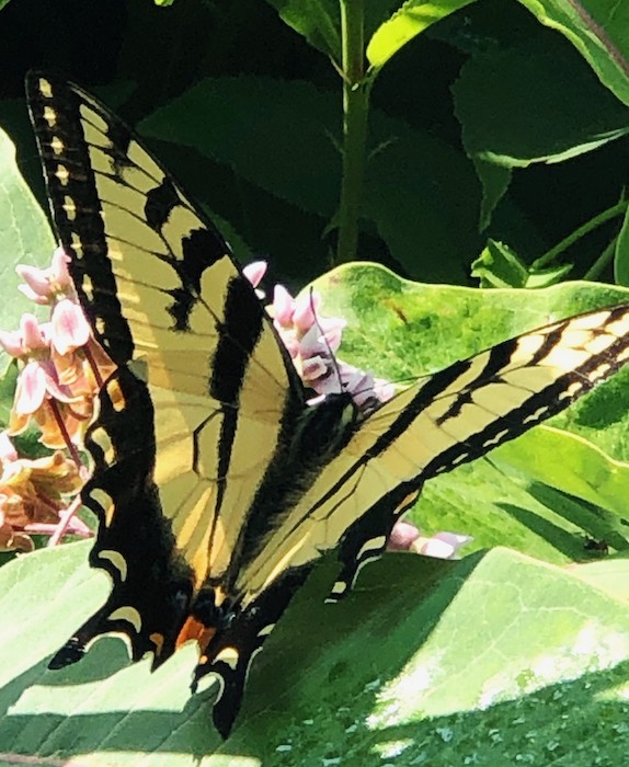 With the summer hot weather tigers have been prowling the forest. Tiger swallowtails that is. Here's one sipping some nectar from a milkweed flower cluster. The tiger swallowtail is the largest butterfly in our neck of the woods.