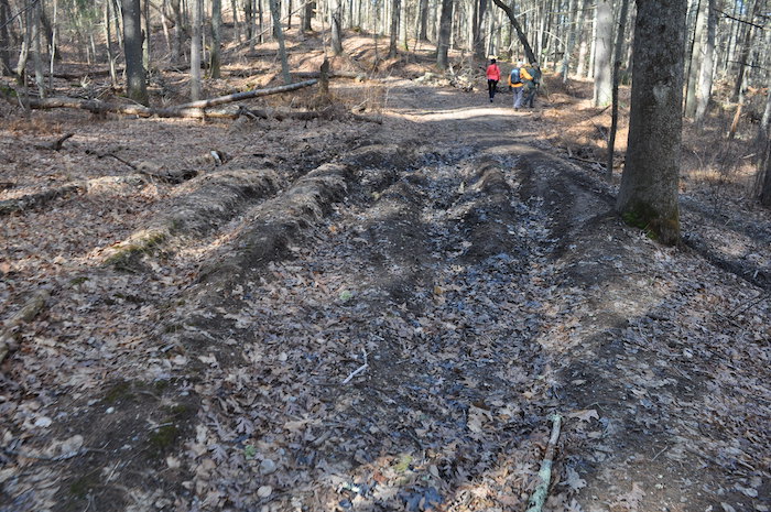 Miles and miles of illegally cut trails. Once again, apparently no one at DCR cares. Illegal dirt bike track creators removed sections of historic stonewalls and have cut trees that were in their way. On the Southeastern Massachusetts Bioreserve Trail Map and Guide park on Bell Rock Road at map maker DD1. Half way between DD1 and DD2 there is a new illegal trail that runs north. White diamond shape on the map with a 5 on it is the location of Dr. Durfee's Mill Pond. There is a tremendous amount of local history in the old mill pond and mill area. For some of that history google Dr. Nathan Durfee, Fall River. Some years ago a DCR official proposed erecting an interpretive historical kiosk next to the old mill. We're still waiting.