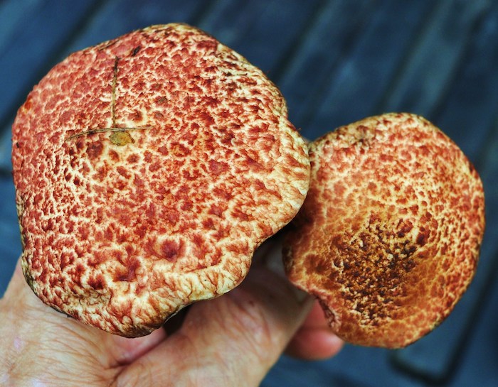 We've had a rainy spring. Rain brings mushrooms. Liz found these painted boletes (Suillus spraguei) that grow under eastern white pines.