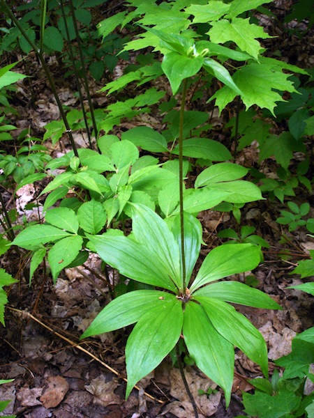 The single, unbranched stem that grows from the rhizome has one or two whorls (circular arrangement) of lance-shaped leaves, the number depending on the health and age of the plant, completely encircling the stem. The lower whorl, or single whorl of a single whorl Indian cucumber, contains 5 to 9 leaves. On those plants with an upper whorl there are 3 to 5 leaves in that whorl.