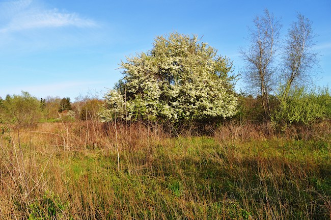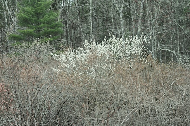 Yea! An early blooming native. Shadbush, juneberry or serviceberry (Amelanchier canadensis) grows in wet areas and received one of its popular names because it blooms in the spring at the same time American shad (Alosa sapidissima) are ascending local rivers to spawn. Shadbush produces an edible berry in early summer.