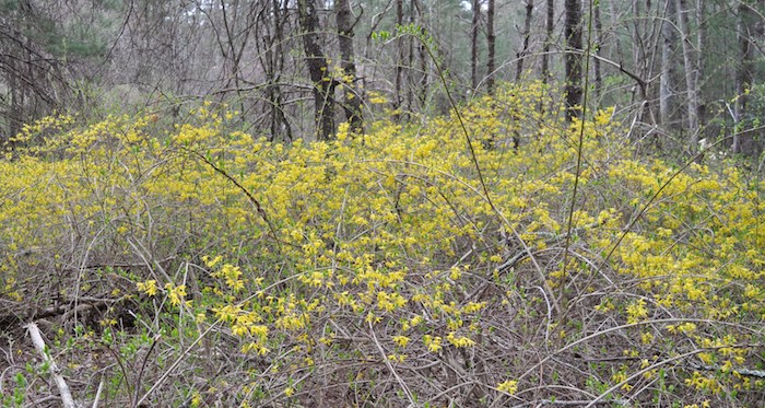 Forsythia gone wild at Wernick Farm Reserve, a Dartmouth Natural Resources Trust (DNRT) property, adjacent to the southern edge of the Southeastern Massachusetts Bioreserve. Forsythia's original home range is southeastern Europe and Asia.